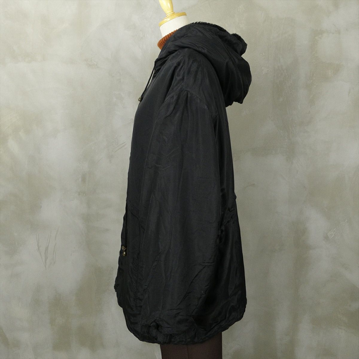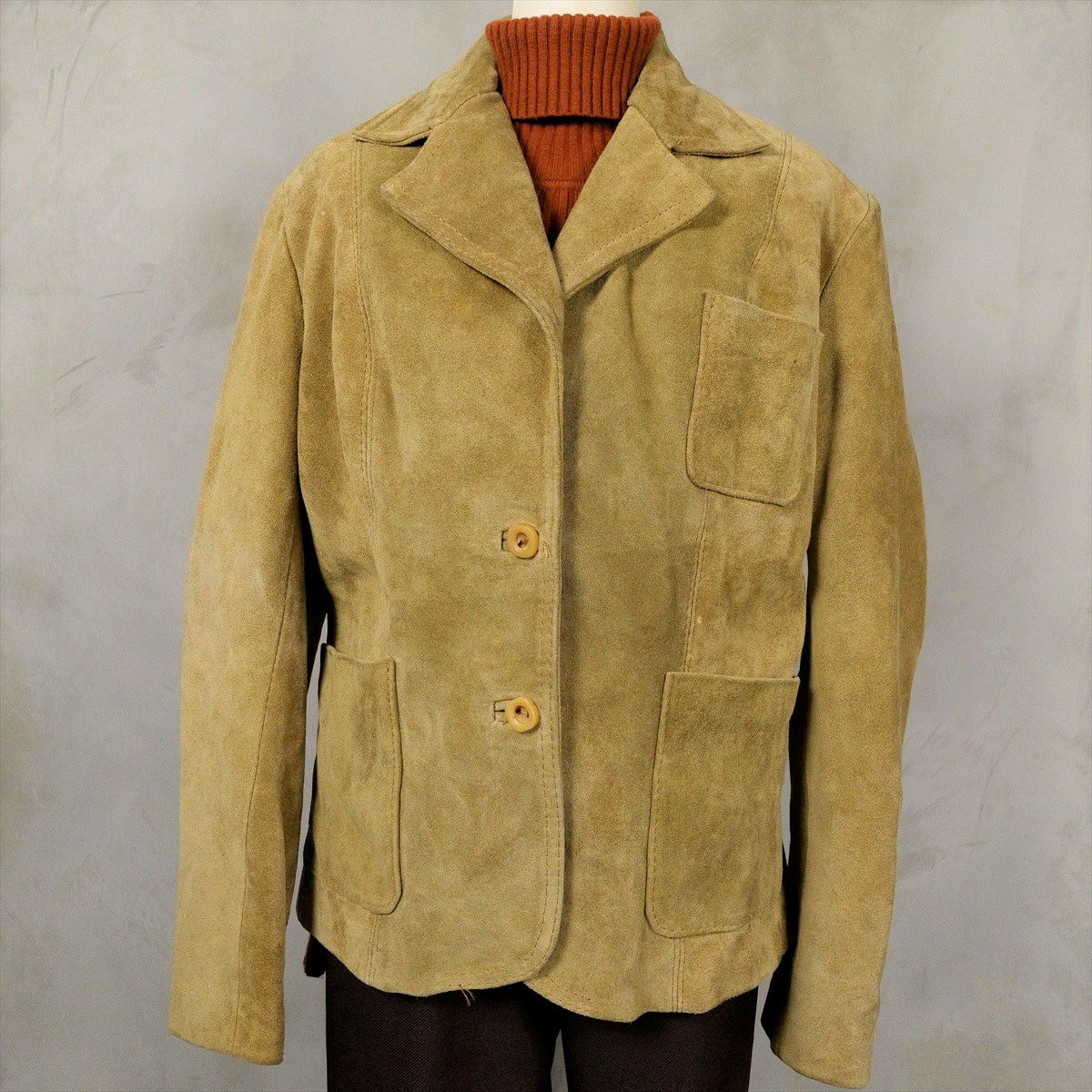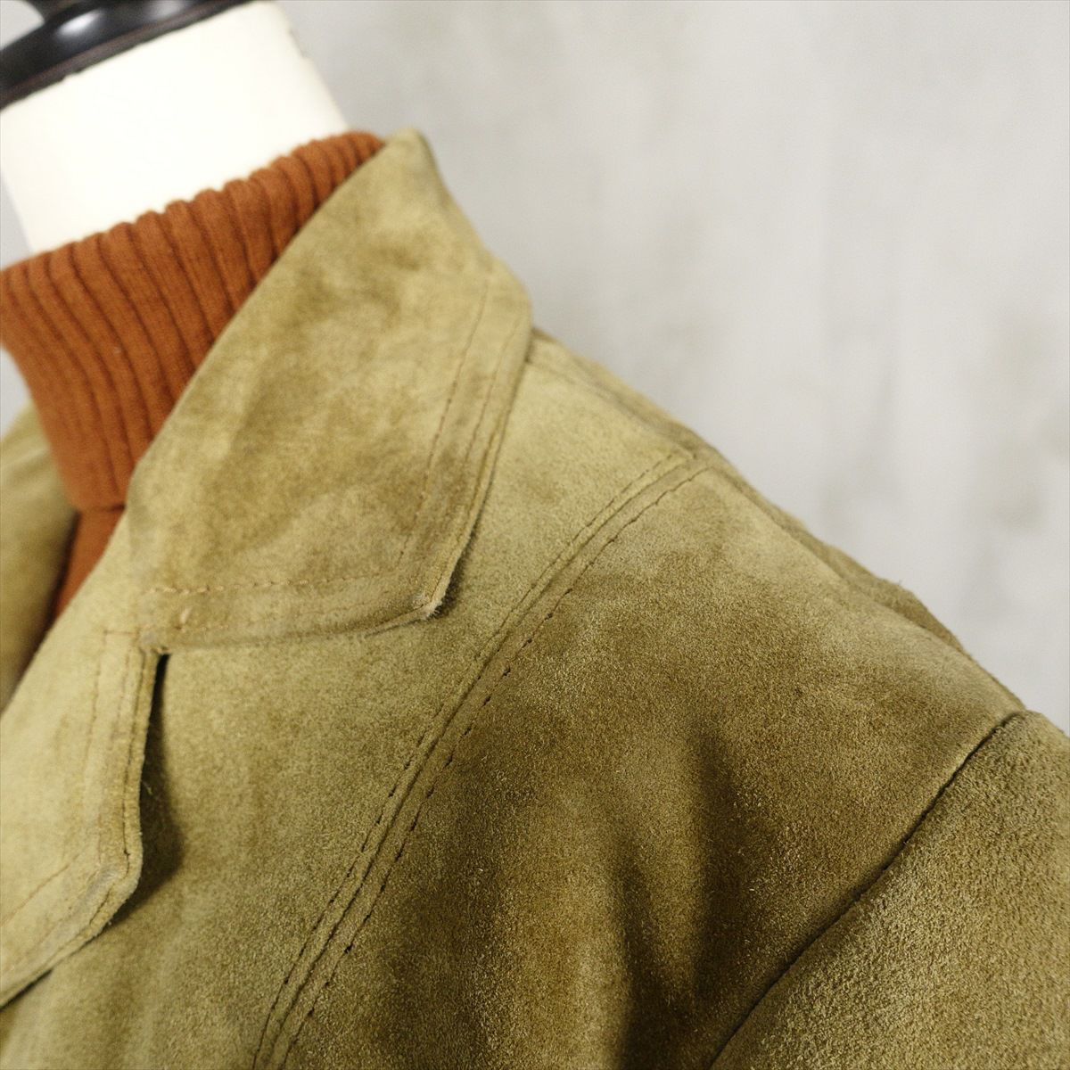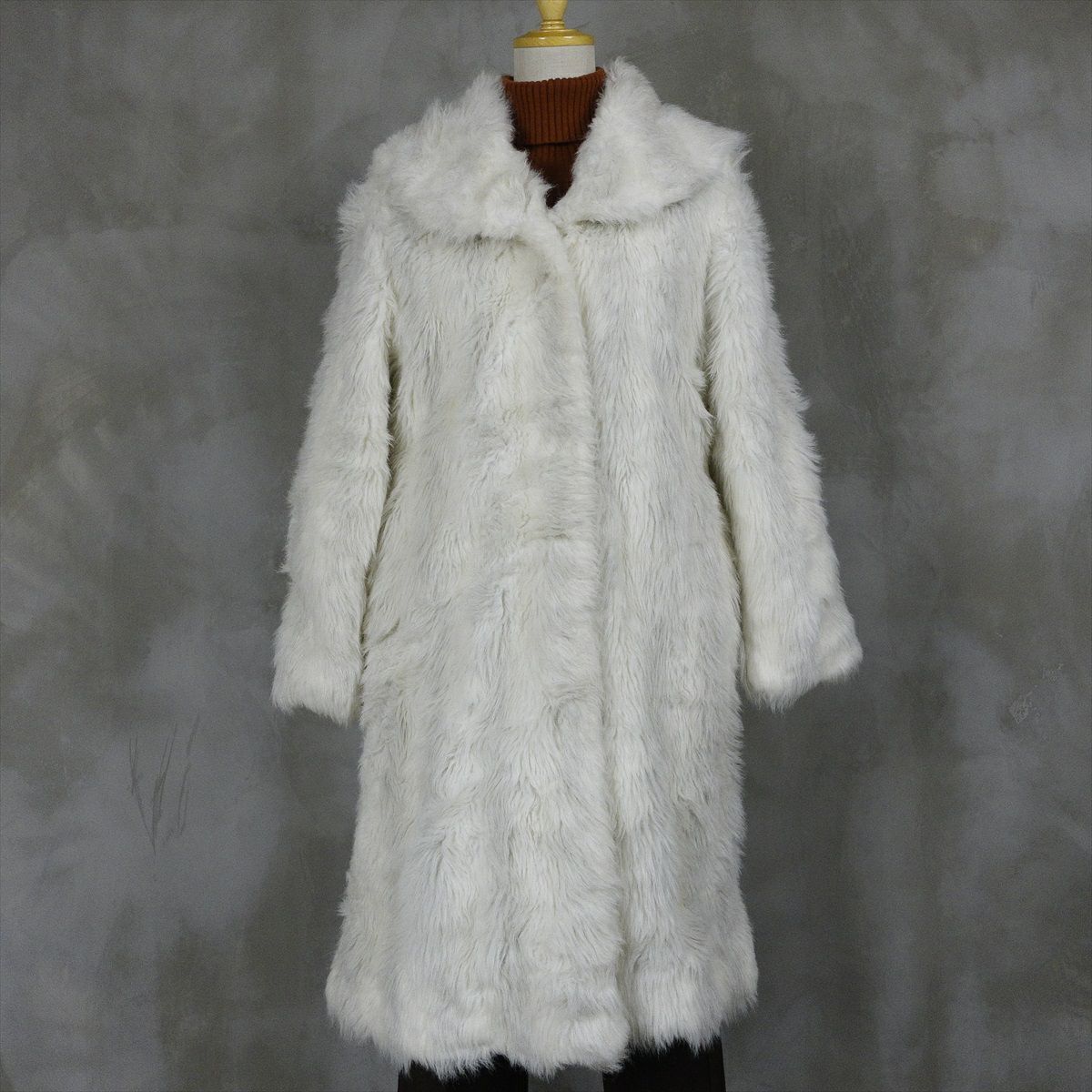 合皮のレザーで作られたノーカラーのコートです。 シンプルな作りですが、ステッチがアクセントとなり一枚で可愛いデザインです。 ウェストのベルトを絞るとワンピースのようにも着て頂けます。 古着では珍しい肩の落ちるデザインの為、着こなしやすいレザーアイテムです。