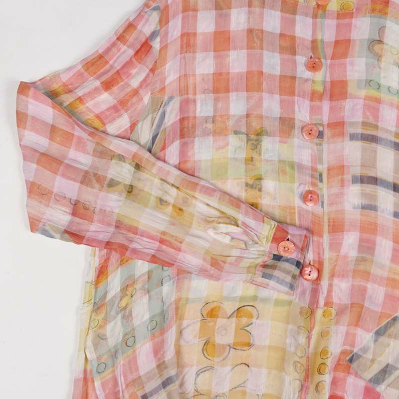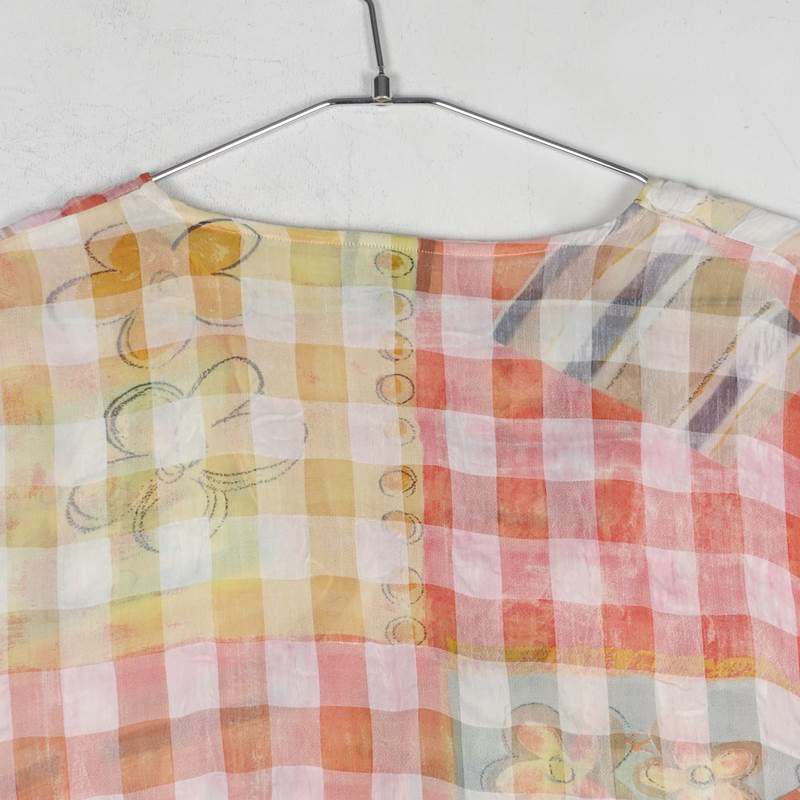 古着 シースルー ノーカラー チェック 長袖シャツ