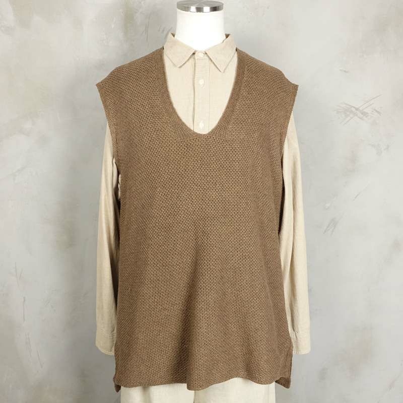 他の画像を見る fafatt ファファット コットン ニットベスト ブラウン 販売価格 ¥ 6,380 税込 コットンニット素材で作られたニットベストです。 人気のブラウン色で、ゆったりとしたシルエットが特徴となっています。 Tシャツの上から合わせて着るのはもちろん、ワンピースや大きめのシャツの上からレイヤードして着られるので、女性の方にもおすすめです。 コットンニットなので、春や秋にもサラッと着て頂けます。冬はインナーとしてジャケットやコートと合わせるのも良いですね。 カートに入れる お気に入りに登録する
