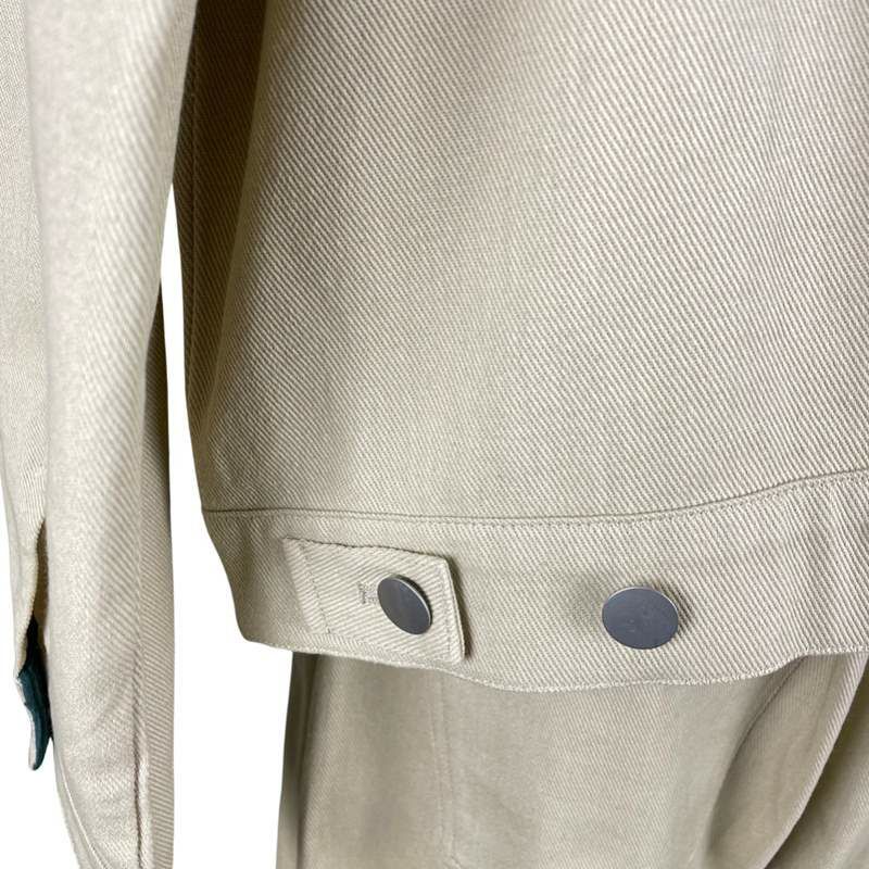 他の画像を見る 袖切り替えスタジャン ブラックデニム×ホワイトグリーン 販売価格 ¥ 12,980 税込 袖がホワイトとグリーンのコットン生地、ボディーがブラックデニムを使用した個性的な切り替えのスタジャンです。トレンドカラーを取り入れつつも、コーディネートに落とし込みやすい配色となっています。ポケットの縁には袖の緑と同色のパイピングを施しており、バランスのいいディティールも特徴的です。裏地が付いているので着やすくなっており、スウェットやニットにも合わせやすいです。女性のコーディネートにも合わせやすいデザインになっているので、オーバーサイズに着て頂くのがおすすめです。 カートに入れる お気に入りに登録する