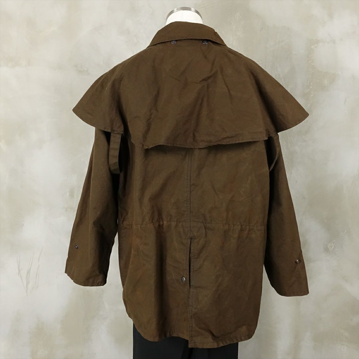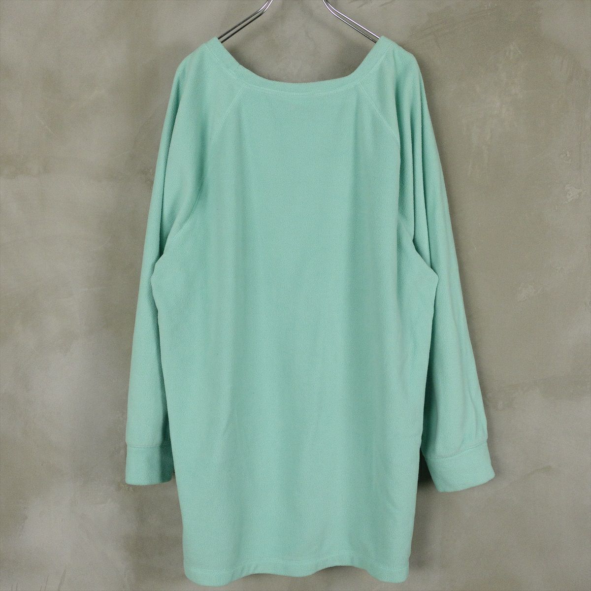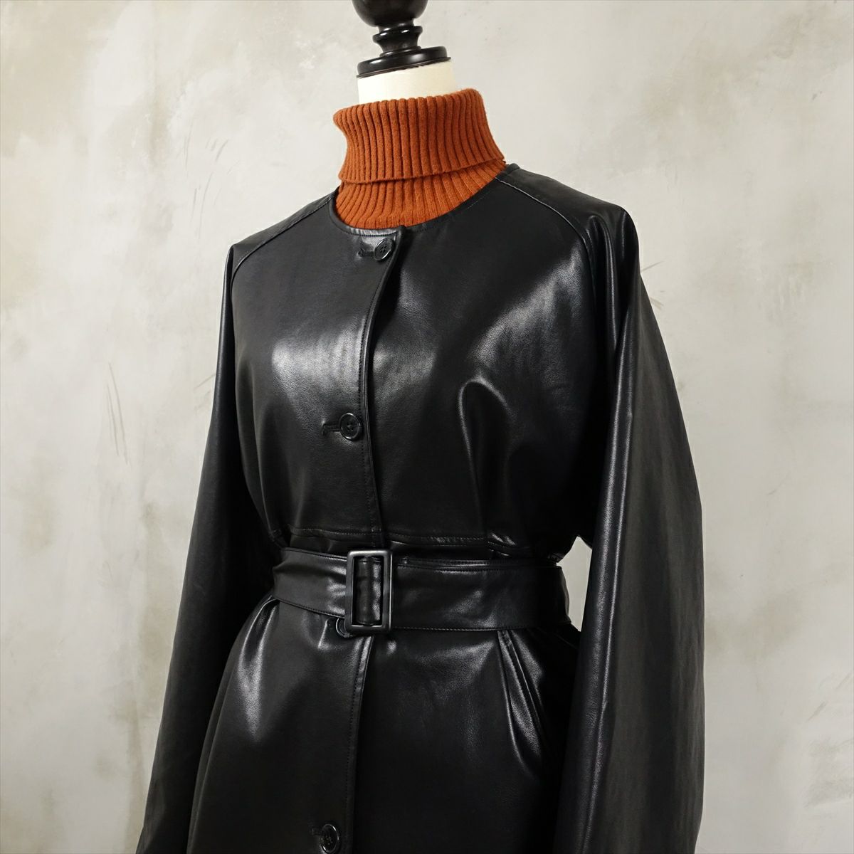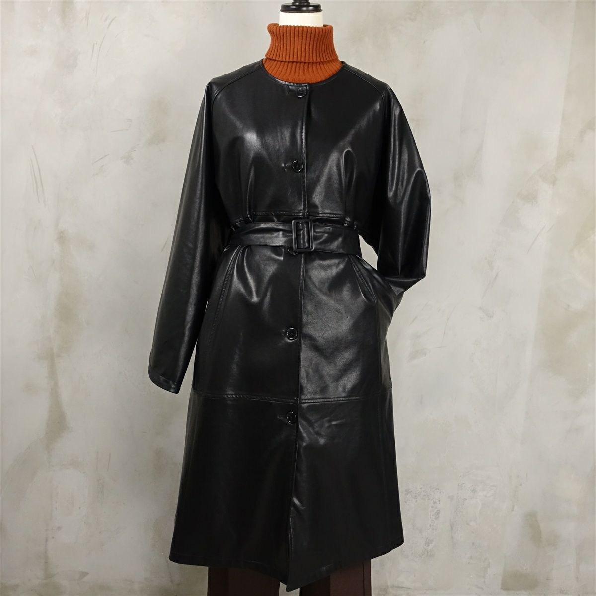 合皮のレザーで作られたノーカラーのコートです。 シンプルな作りですが、ステッチがアクセントとなり一枚で可愛いデザインです。 ウェストのベルトを絞るとワンピースのようにも着て頂けます。 古着では珍しい肩の落ちるデザインの為、着こなしやすいレザーアイテムです。