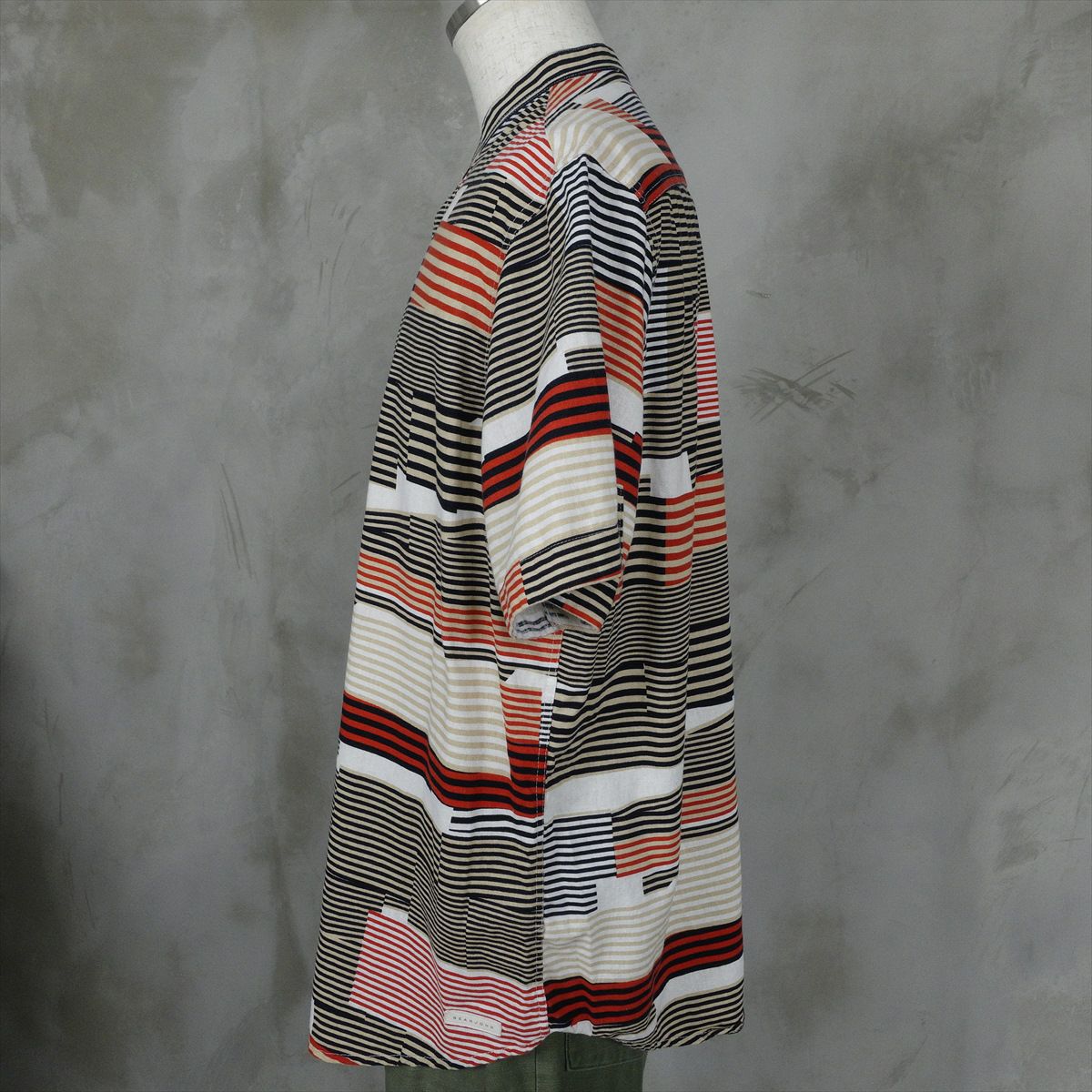 古着 クレイジーパターン ボーダー ノーカラー 半袖シャツ