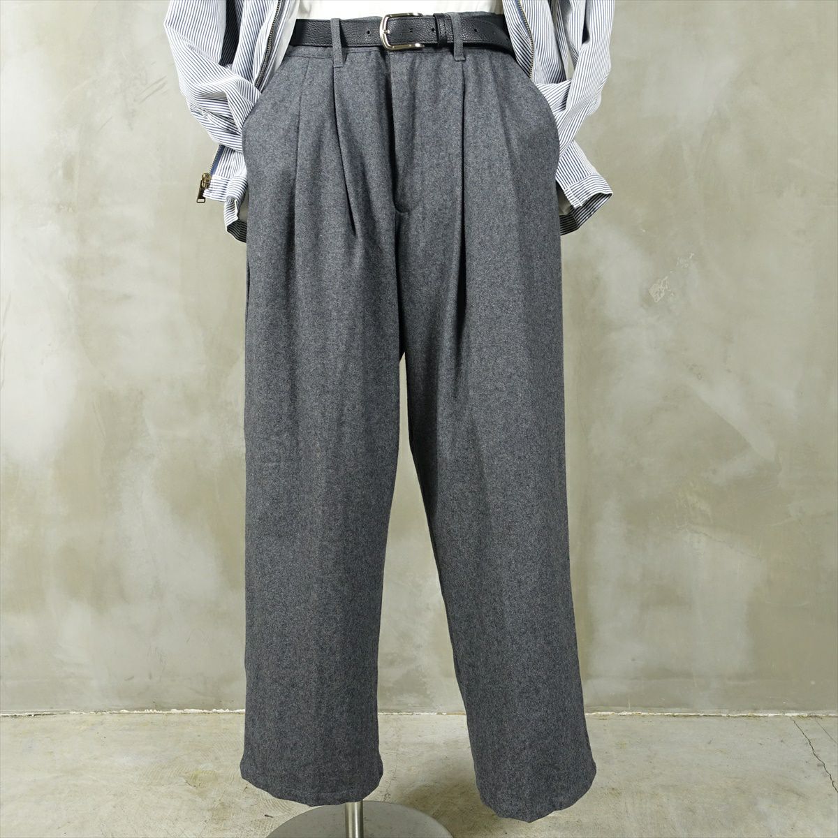 他の画像を見る fafatt ファファット スラックス 販売価格 ¥ 6,380 税込 ウールとポリエステル50%の秋冬向けスラックスです。しっかりとした裏地が付いているのでウール特有のチクチク感がなくサラッとご着用頂けます。フロントにタックが入っているのでシルエットも綺麗です。中間色のグレーなのでどんな色でも相性が良いため普段使いの1着としていかがでしょうか カートに入れる お気に入りに登録する