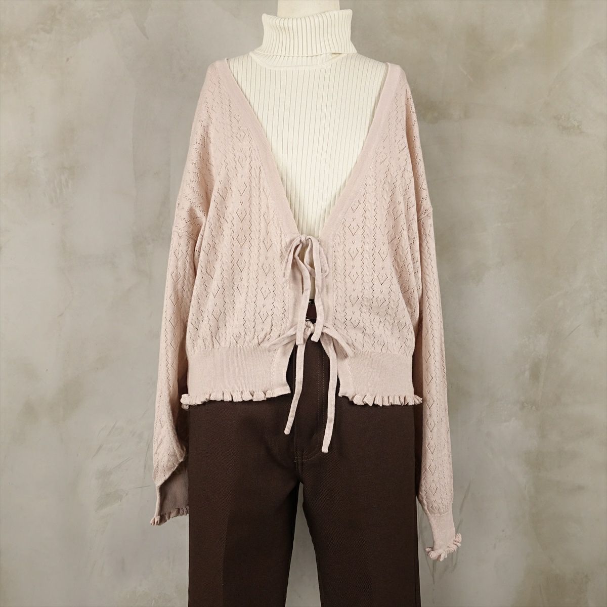 他の画像を見る fafatt ファファット リボンカーディガン 販売価格 ¥ 6,380 税込 パンチングされたニットのカーディガンです。リブの先にフリルが付いていたりリボンで前をとめたり細部にまで可愛いに拘ったアイテムです。上にモヘアのカーディガンやジャケットを羽織ってリボンを見せる着方もオススメです。 カートに入れる お気に入りに登録する