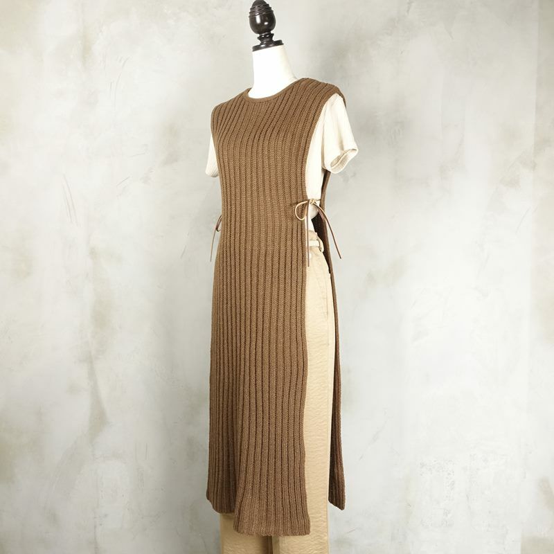 両サイドが開いたデザインのニットワンピースです。 タイトなデザインですが、ニット素材で伸縮性がある為着心地が良いです。 サイドの紐がレザーになっているのもポイントで、大人っぽい雰囲気になります。 パンツスタイルの上に重ねたり、ワンピースの上に重ねたりしても可愛いです。 シンプルな服にプラスするだけで、いつもとは違うコーディネートを楽しめます。