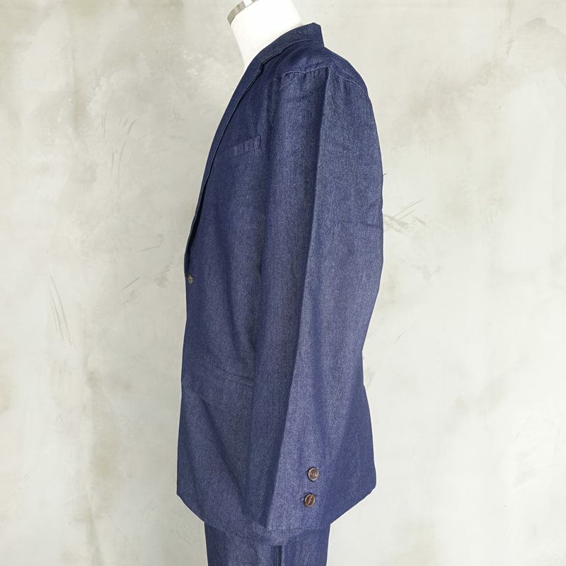 人気素材のデニムを使用した、テーラードジャケットです。 フロント下部には2つポケットが付いており、左胸のポケットは斜めにあしらわれている為、実用性に優れています。 中にシャツなどを合わせて綺麗めに着て頂くのも良し、Tシャツとネックレスを合わせてカジュアルに着て頂くのもおすすめです。 同生地同カラーでボトムも展開しているので、セットアップとしてもお着用頂けます。