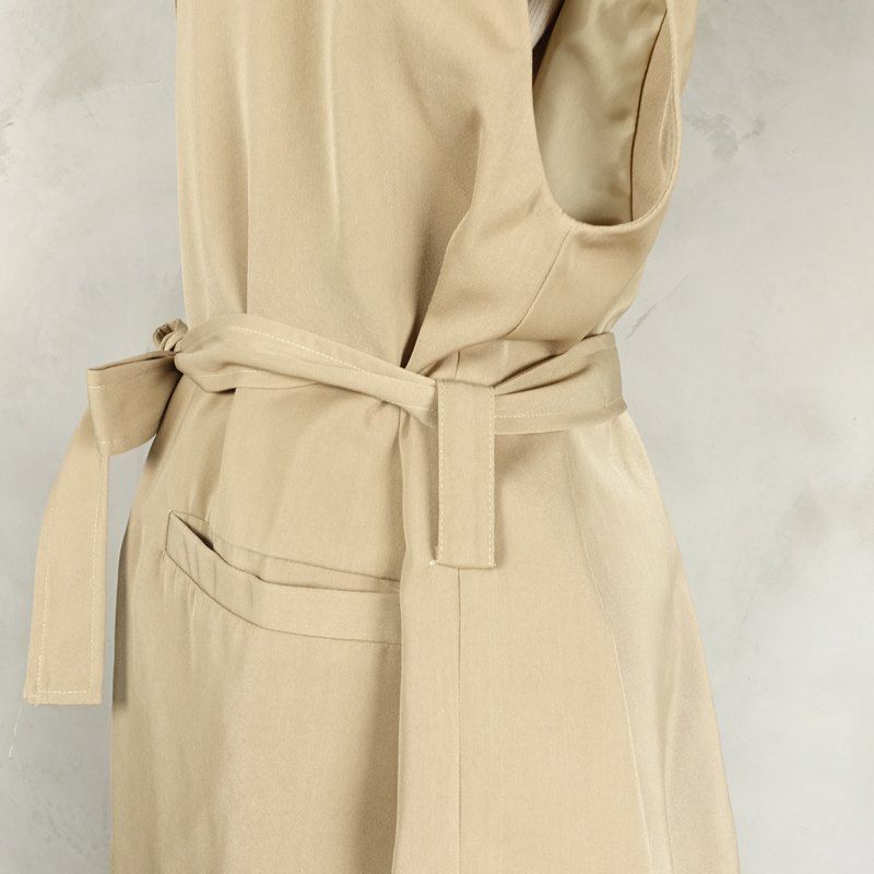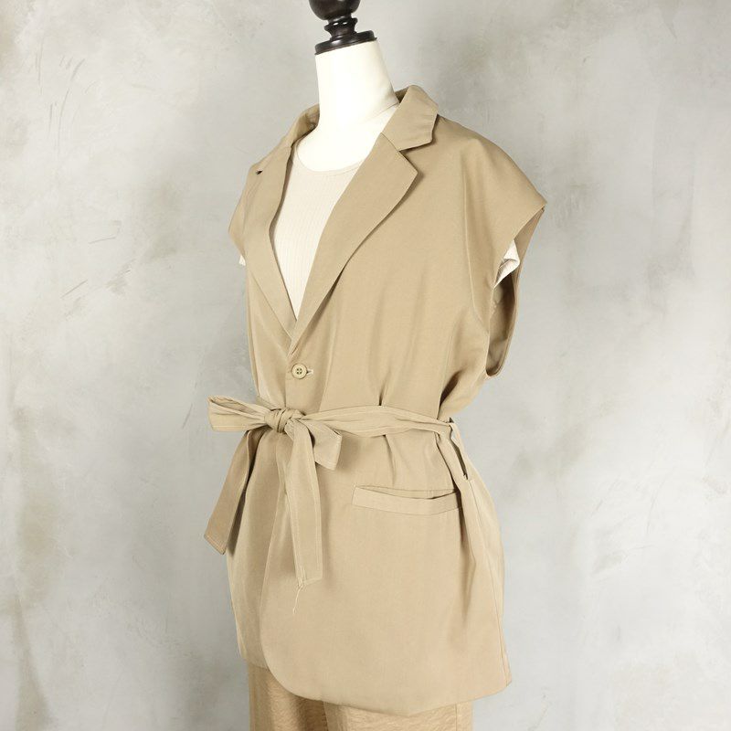 ウエストを絞れるテーラード形のベストです。前を閉めてウエストを絞るのはもちろんですが、紐を取って前を開けて着るとまた違った格好いい雰囲気になります。シャツやTシャツを合わせて袖を見せたり、タンクトップを合わせて胸元だけ色を見せたりしても可愛いです。