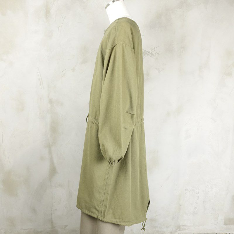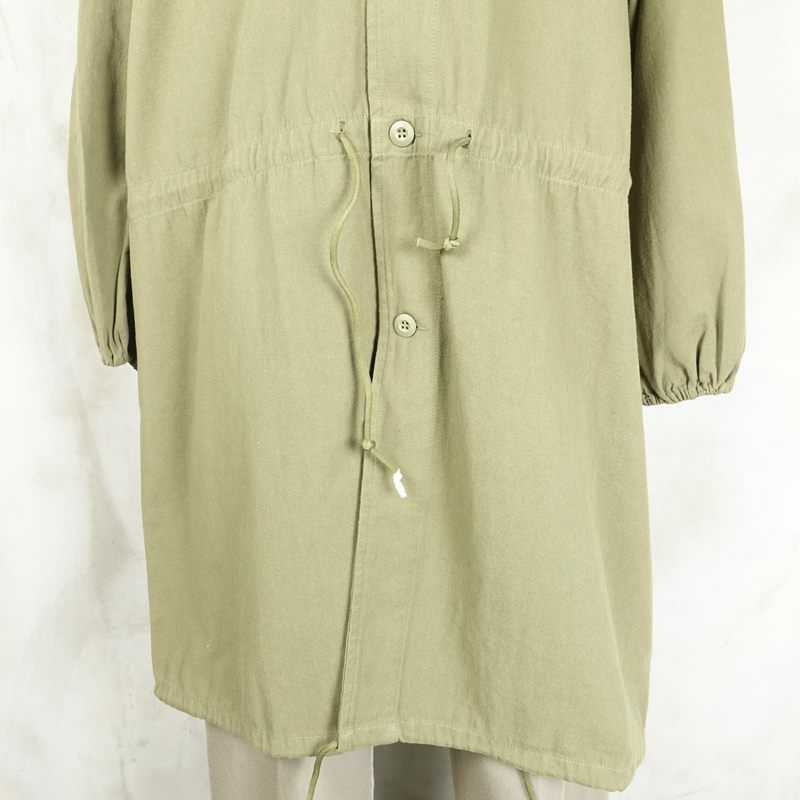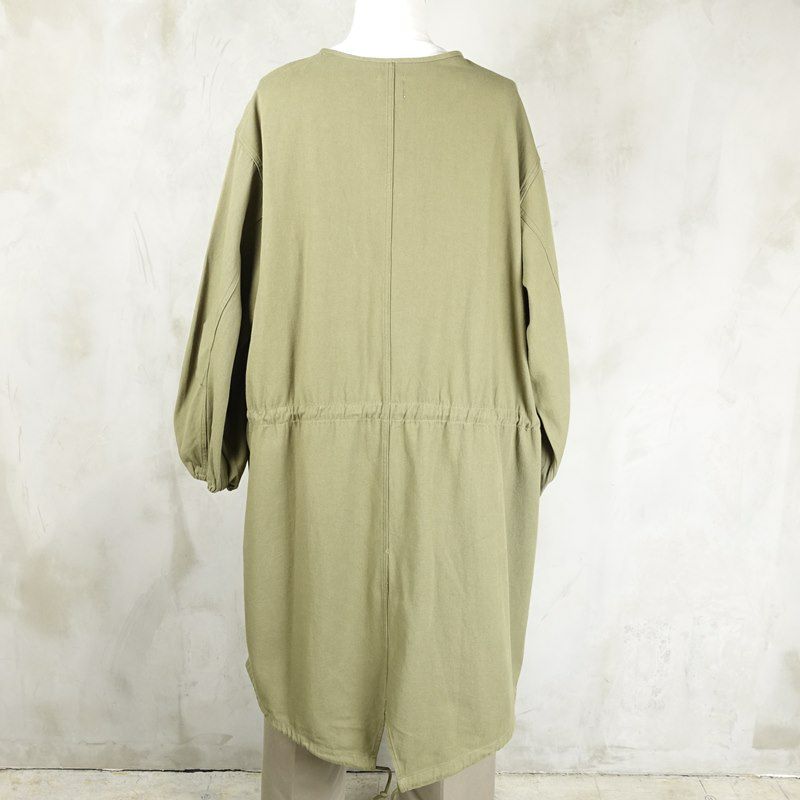 ビンテージのミリタリージャケットにある、ガスコートをサンプリングしたコートです。 基本的なディテールはオリジナルを忠実に再現しています。 合わせやすいカーキ色の為、色んなコーディネートの上からサラッと羽織るのは勿論、女性の方がワンピースとして1枚で着るのもおすすめです。 しっかりしたコットンを使用しているので、アウターとして使う他にも、寒い時期にレイヤードとして中に着るスタイリングも出来ます。