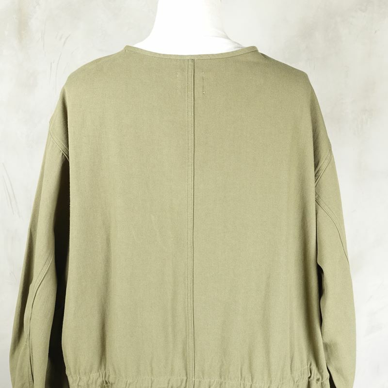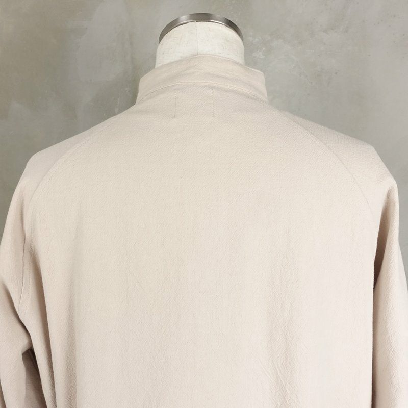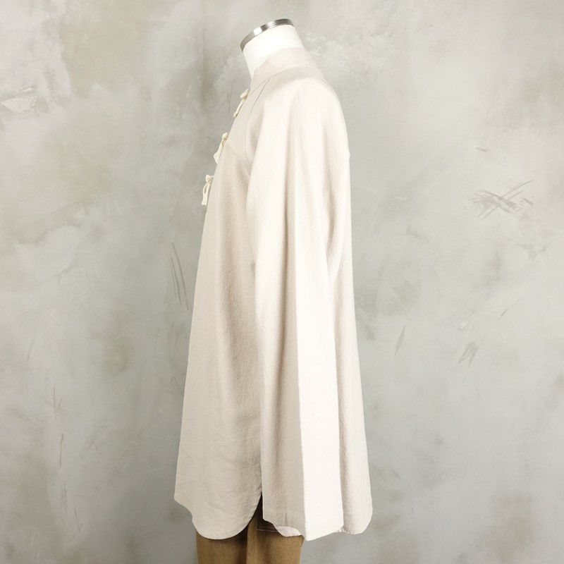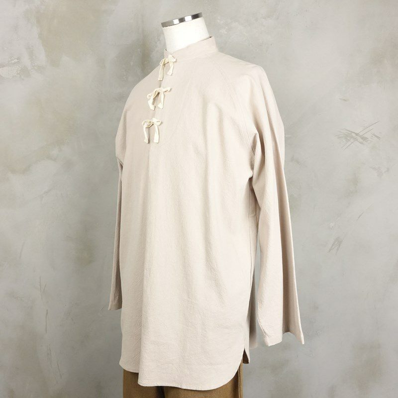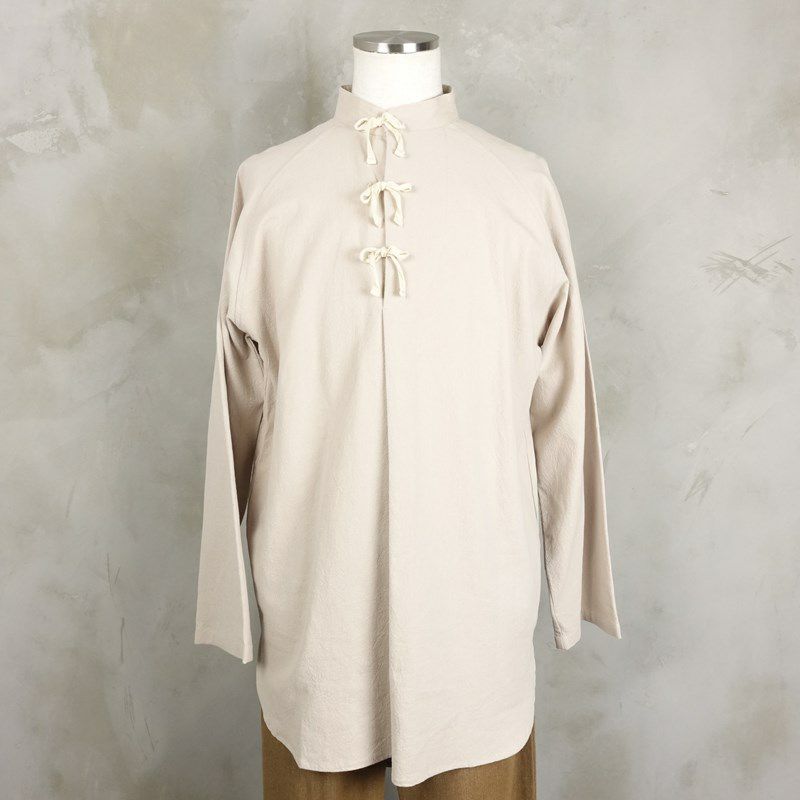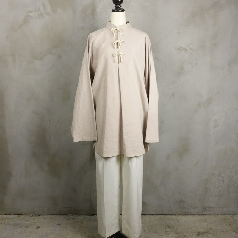 荒めのコットンを使用した、フロントのリボンが特徴のグランパシャツです。 ラグランスリーブの為肩のラインに馴染みやすいので、着心地も良いです。 紐を全部結んで1枚で着るのはもちろん、解いてインナーを見せる着方もして頂けます。 燻んだベージュカラーが、アースカラーと相性が良いので、ミリタリーなどを合わせた古着らしいコーディネートもおすすめです。