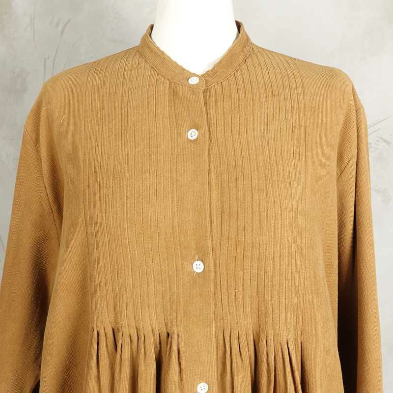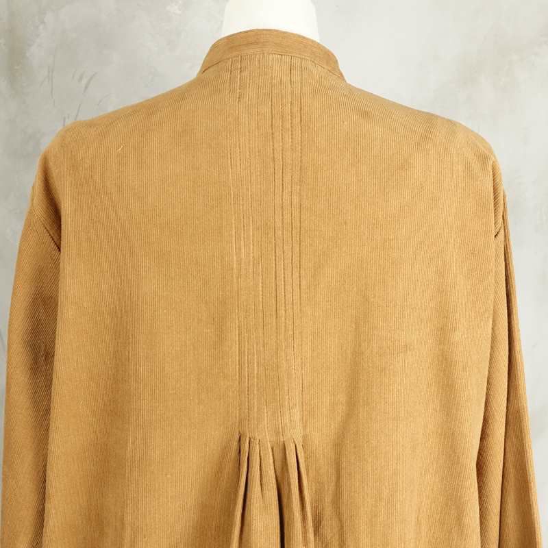 細畝のコーデュロイ生地で出来たタックワンピースです。 細かいタックがプリーツのようになり、スカートが広がるデザインになっています。 ロング丈で温かみのある雰囲気ですが、ノーカラーなので首元をスッキリ見せてくれます。 前がボタンで開くデザインになっている為、ワンピースとしてだけでなくコートのように羽織りとしても着て頂けます。