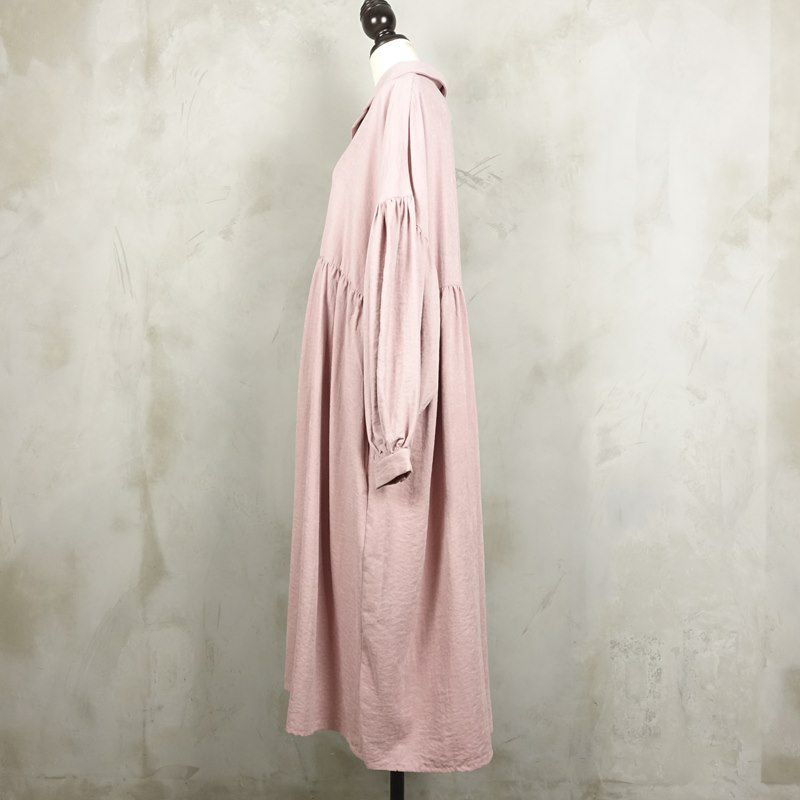 袖とウエスト部分にギャザーが入ったワンピースです。パフスリーブのように大きく広がる袖が特徴です。前のボタンを全て閉めてワンピースとしてはもちろん、ボタンを開けてコートのように羽織ることも出来ます。 襟部分は開襟シャツのようなデザインになっている為甘くなりすぎず、様々なコーディネートに合わせることができます。
