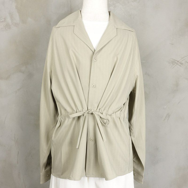 ハリのある柔らかさや、ウエストに付いている絞りが特徴的なストライプのシャツジャケットです。 くすみのあるカラーが今っぽく、合わせやすいので、男女どちらでもご着用頂けます。 絞らすにシャツとして着る、ウエストを絞ってアクセントを付ける、開いた状態で紐を縛るなど、 色んな着こなし方があるので、実際に着てコーディネートを楽しんで頂きたいです。