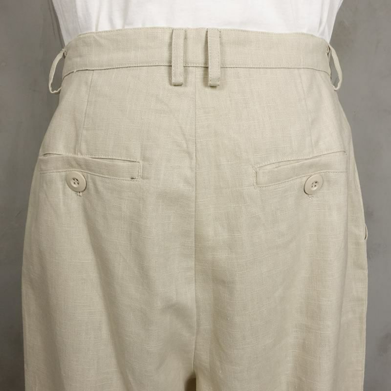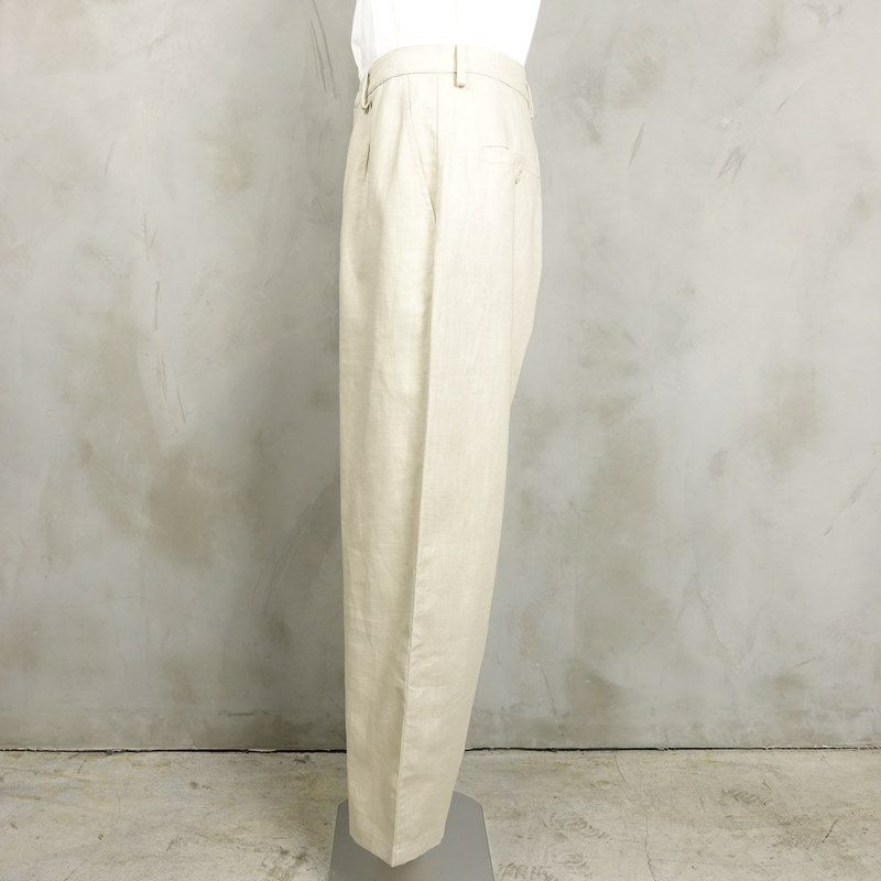 1タック入りでややテーパードがかかったリネン素材のスラックスです。 コットン生地のパンツよりも柔らかい印象が強いため、アースカラーなどと相性が良いアイテムとなっています。 また、こちらのアイテムは別売りのテーラードジャケットと合わせてセットアップとしてもご着用頂けます。