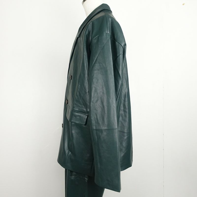 他の画像を見る レザージャケット グリーン 販売価格 ¥ 11,880 税込 在庫切れ 人気のレザーを使用したダブルテーラードジャケットです。トレンドカラーでもあるグリーンですが、派手すぎない深みのある緑で大人っぽく仕上がっています。フロントに大きめのポケットが3つ付いており、女性の方でも着て頂けるゆったりとしたシルエットが特徴です。スウェットやパーカー、色を合わせたコーディネートがおすすめです。また、春先でもTシャツなどに合わせて着て頂けます。フレアパンツや太めのカーゴパンツに合わせると今っぽく着こなせます。同生地同色のパンツもありますので、セットアップとしても楽しんで頂けます。 詳細を見る お気に入りに登録する