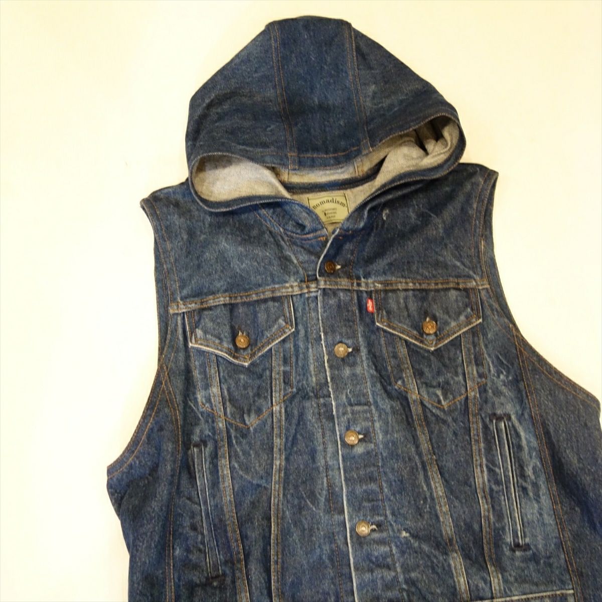 他の画像を見る Denim Hooded Wide Vest BLU 販売価格 ¥ 42,680 税込 在庫切れ Gジャンとデニムパンツを素材として製作しております。フロントのGジャン部分を活かし、デニムパンツでフード部分を製作しております。 詳細を見る お気に入りに登録する