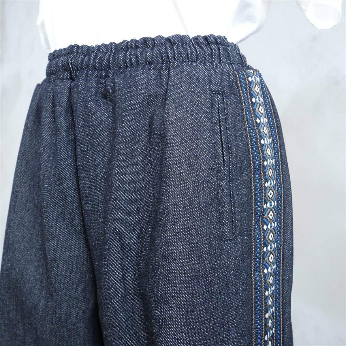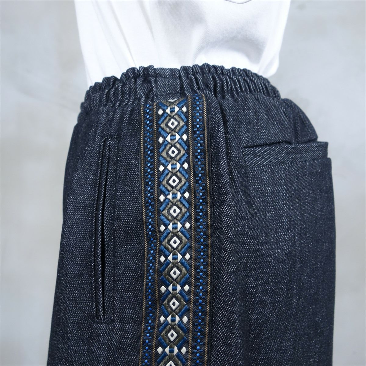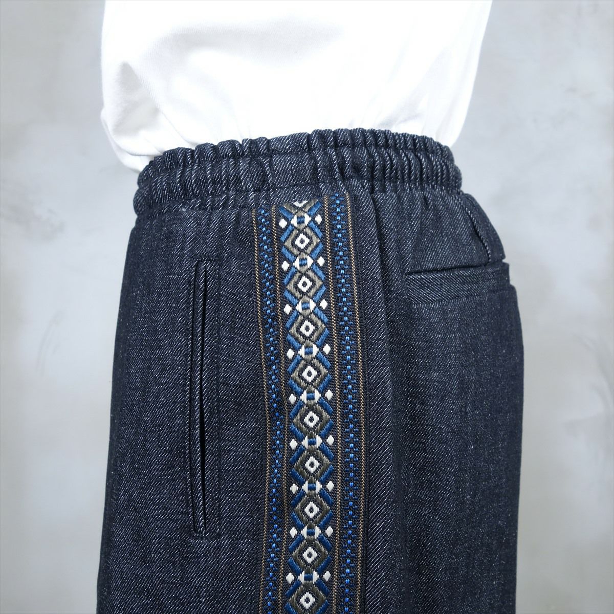 他の画像を見る Fafatt ファファット ブラックデニムイージーパンツ 販売価格 ¥ 7,480 税込 厚手のブラックデニムのイージーパンツです。ウェスト内側にゴムがあるので、お好きなサイズ感で履いて頂けます。しっかりした生地なので、ロールアップしても格好よくスタイリングが組めます。サイドにチロリアンテープが施されているので、シンプルな装いにも合わせやすい1本となっております。デニムブルゾンとセットアップ仕様になっております。 カートに入れる お気に入りに登録する
